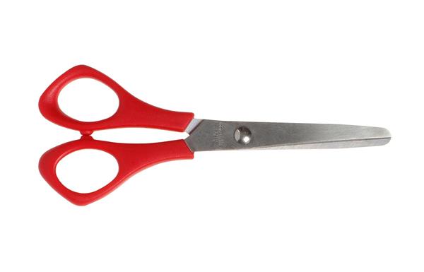 Kinderschaar met licht afgeronde punten in twee uitvoeringen: zwart voor rechtshandigen en rood voor linkshandigen.