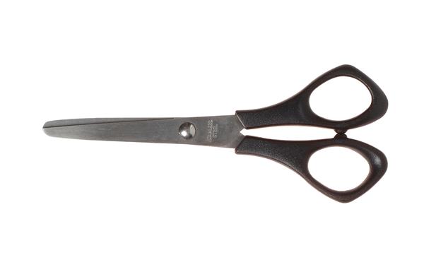 Kinderschaar met licht afgeronde punten in twee uitvoeringen: zwart voor rechtshandigen en rood voor linkshandigen.